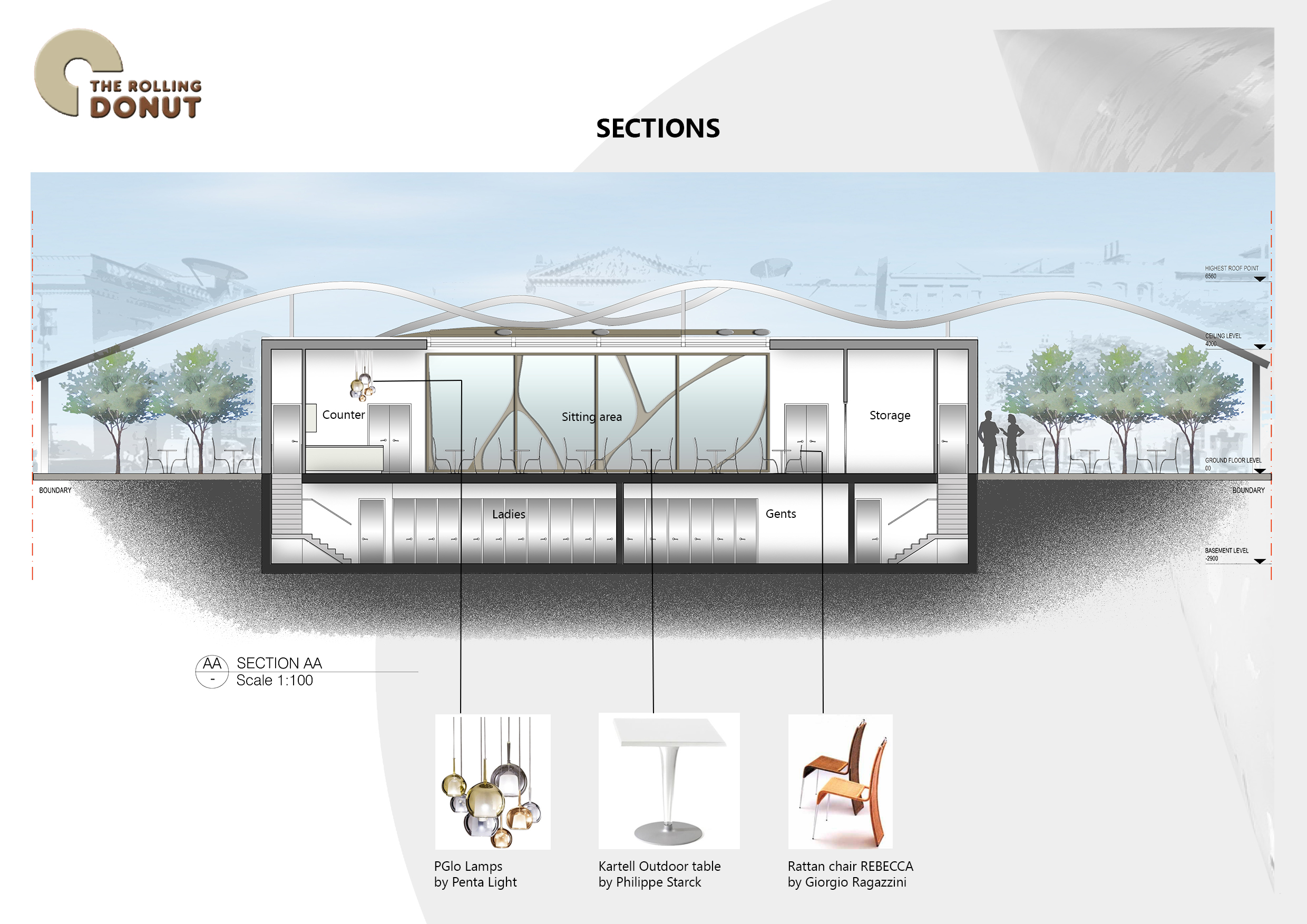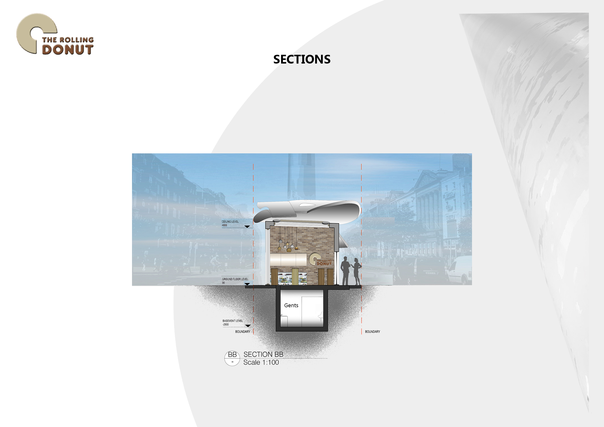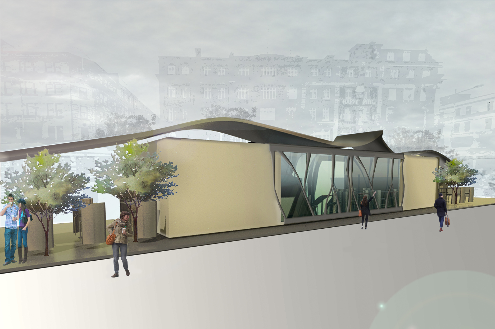 The project brief was to design a cafe on O’Connell Street in Dublin that would look organic and would not interfere with the street surroundings. The design was inspired by 120 metres high Spire that is the focal point of O’Connell Street. Since the location of the cafe was the green island, it was important to us to make the cafe complimentary to the spire. The design evolved into a rectangular shape that was visually divided into three sections. The middle section was made of glass, and the end sections were made of Kingspan panels to replicate the stone buildings in the area. The glass section helped to provide light and gave modern touch to the cafe. The sculptural shape of the roof was made of aluminium to replicate the material used in the Spire. The roof also provided shelter for the outdoor sitting area. The large windows facing the East and West provided adequate natural light all day and connected the cafe to the street life.