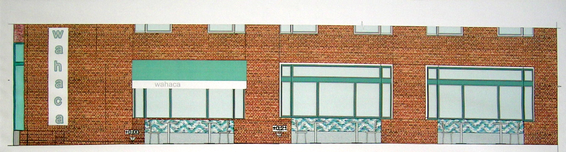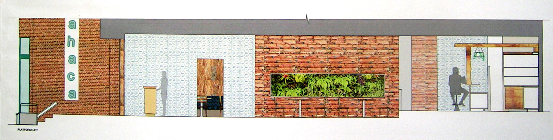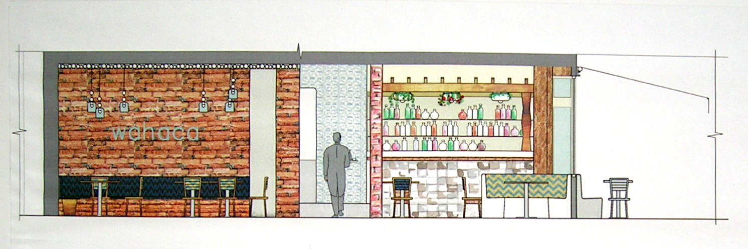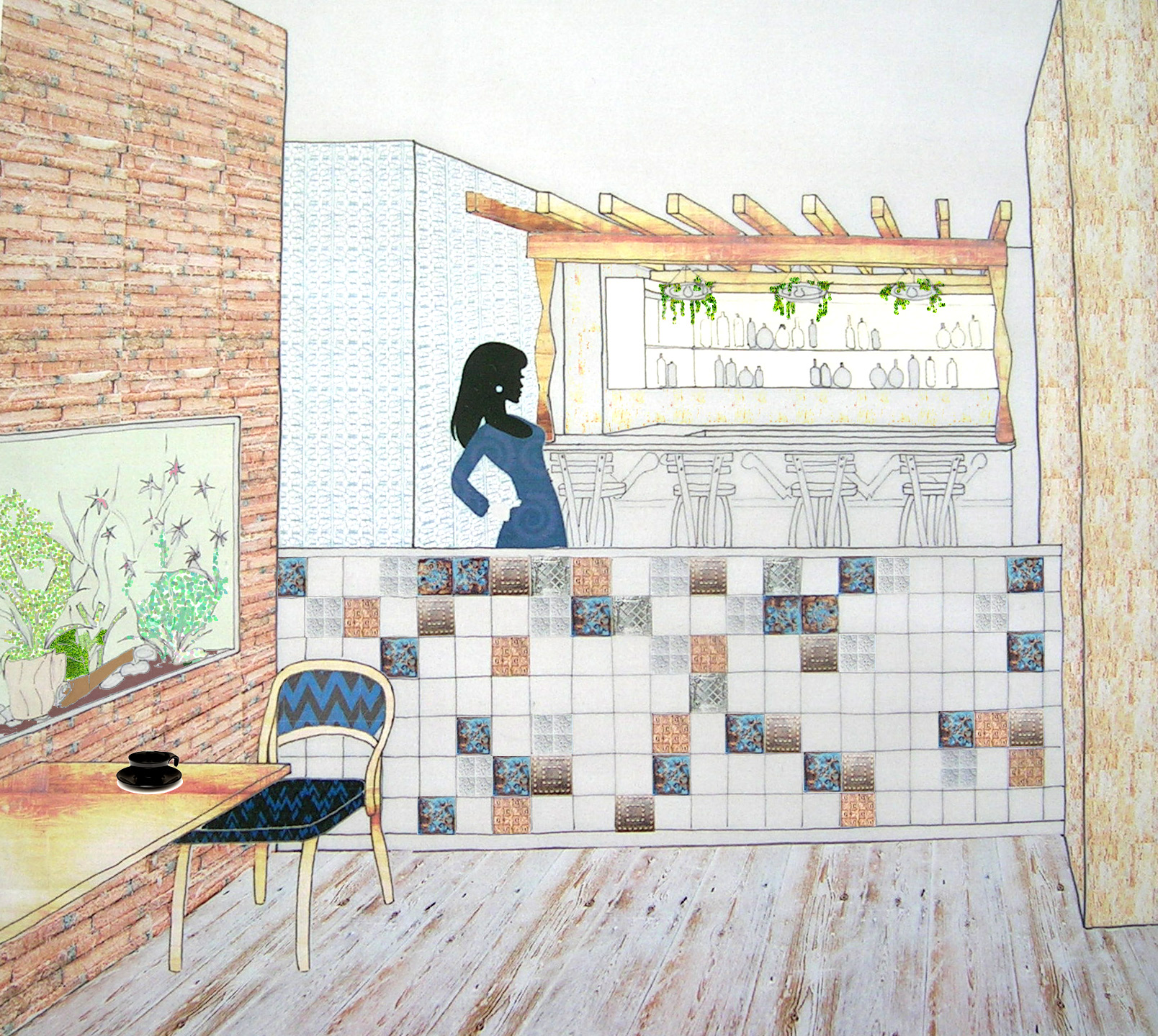 The brief for this project was to design a restaurant for Mexican street-food chain Wahaca. The design was inspired by Pre-columbian Mexico, Aztec masks and jungles. The aim was to create very colourful, exotic and warm jungle-like atmosphere with the use of greenery, red brick and timber, cork and bamboo. Cork panels with their great sound insulation properties and aesthetic look were used for wall cladding. Some walls had exposed red brick appearance. The bar counter and the benches very tiles with bright colour tiles in Mexican motifs. Generous amount of green plants created the colour contrast with red bricks and cork, and created the jungle atmosphere.